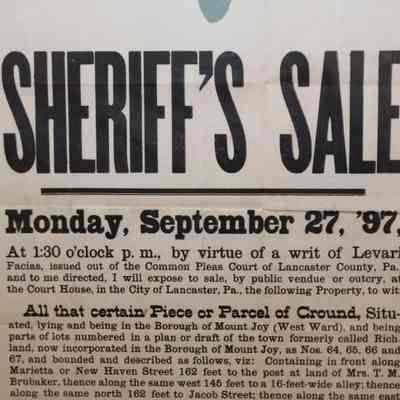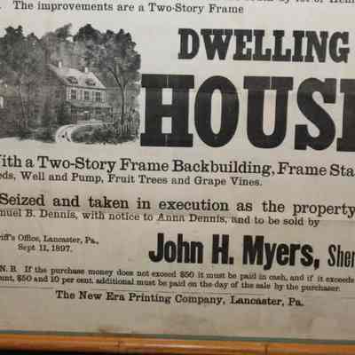 FR BROADSIDE, SHERIFF'S SALE, REAL ESTATE, 1897, PA. JOHN MYERS, SHERIFF. 18 1/2" X 25"