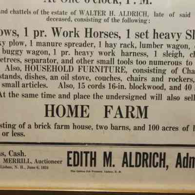 FR BROADSIDE, FARM, 1924, NH. ADMINISTRATRIX' SALE. W.H. MERRILL, AUCTIONEER. 14 3/4" X 17 1/2"