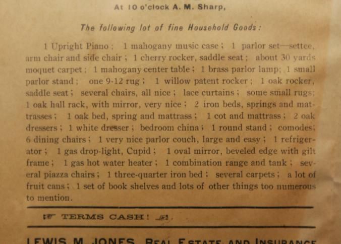 FR BROADSIDE, HOUSEHOLD, 1921, NY. LEWIS JONES, AUCTIONEER. SARATOGA SPRINGS, NY. 9" X 11"