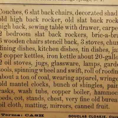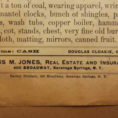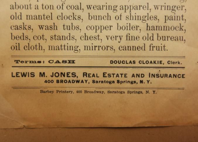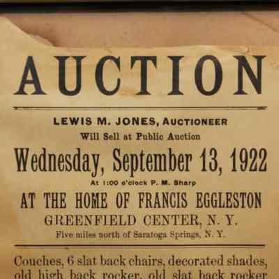 FR BROADSIDE, HOUSEHOLD, 1922, NY. LEWIS JONES, AUCTIONEER. GREENFIELD CENTER, FIVE MI NORTH OF SARATOGA SPRINGS, NY. FURNITURE, ROOFING MATERIALS, CLOTHING, ETC. 8 1/2" X 10 1/2"Created By