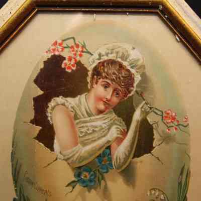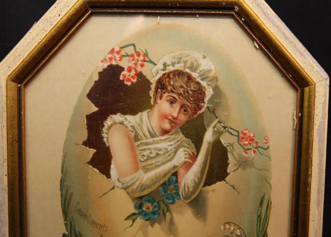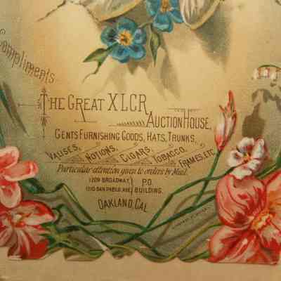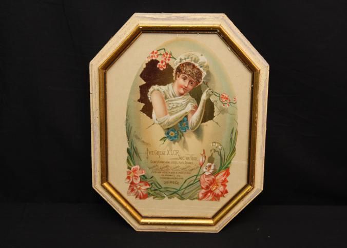 FR ADVERTISING, COLOR PRINT, WOMAN AND FLOWERS, COMPLIMENTS THE GREAT XLCR AUCTION HOUSE, GENTS FURNISHING GOODS, HATS, TRUNKS, ETC. OAKLAND, CA. 9" X 11 OCTAGONAL FRAMECreated By