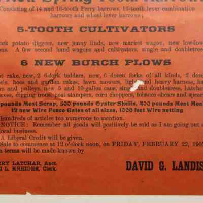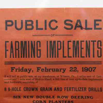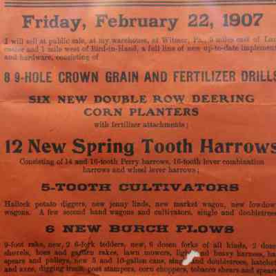 FR BROADSIDE, 1907, PA. FARMING IMPLEMENTS. HARRY LATCHAR, AUCTIONEER. 9 1/2" X 12"