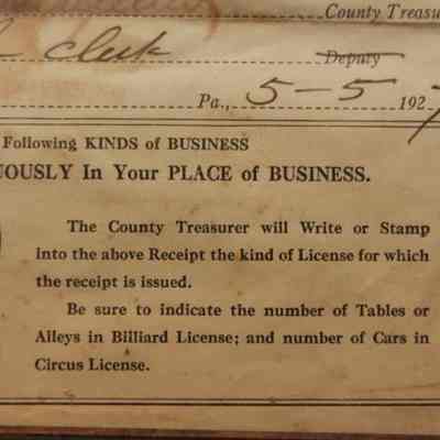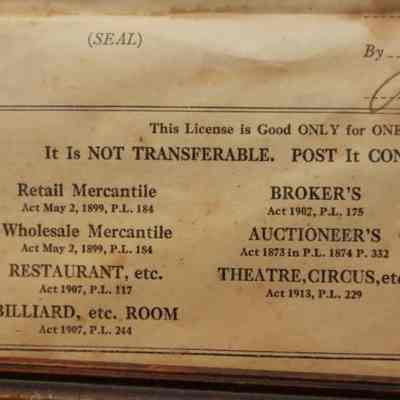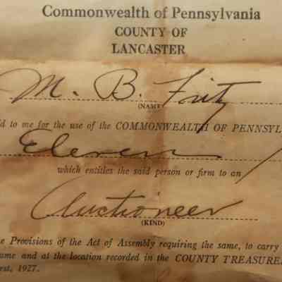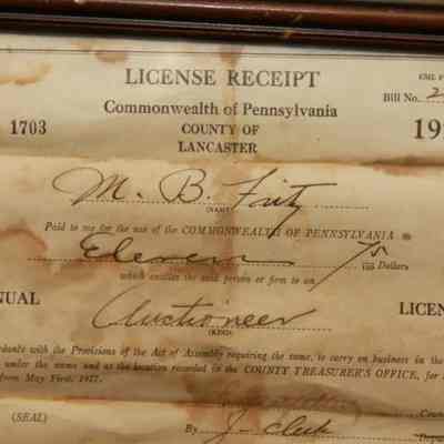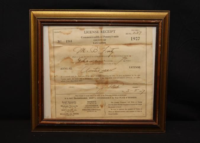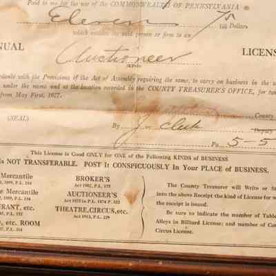 FR DOC, LICENSE RECEIPT, 1927, PA. LANCASTER COUNTY, COMMONWEALTH OF PA. ANNUAL AUCTIONEER LICENSE. 12" X 10"Created By