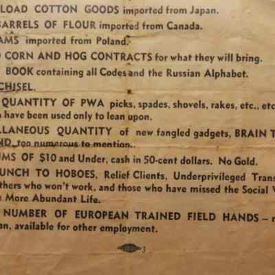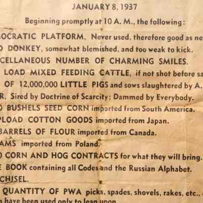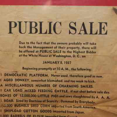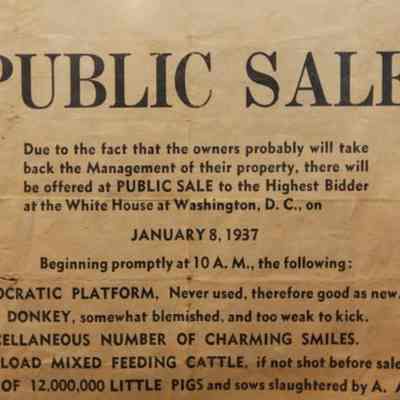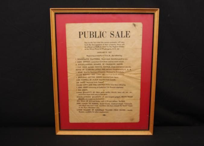 FR BROADSIDE, 1937, WASHINGTON DC. POLITICAL, 1 DEMOCRATIC PLATFORM, 1 AGED DONKEY, A MISC. NUMBER OF CHARMING SMILES… ETC. 11 1/2" X 13 3/4"Created By