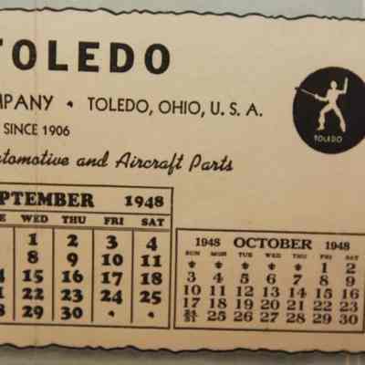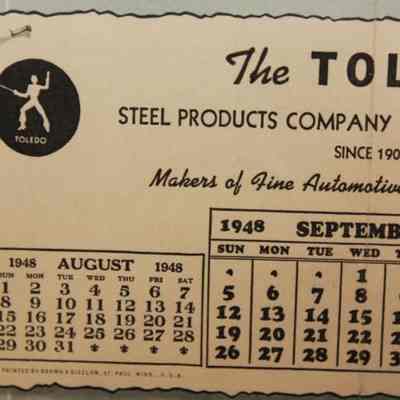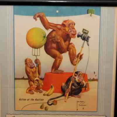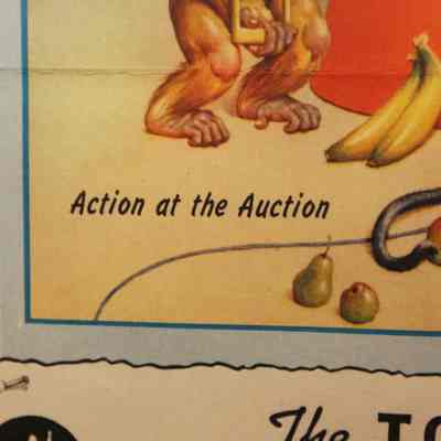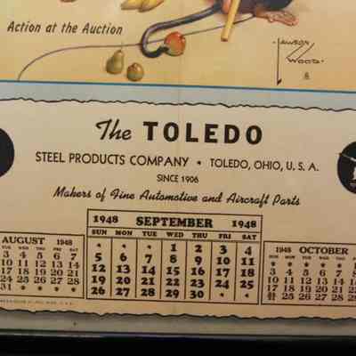 FR ADVERTISING CALENDAR, 1948, OH. "ACTION AT THE AUCTION" MONKEY AT MICROPHONE SELLING FRUIT THAN ANOTHER MONKEY IS HOLDING ON A PITCHFORK. THE TOLEDO STEEL PRODUCTS COMPANY. 10 1/4" X 12 3/4"Created By
