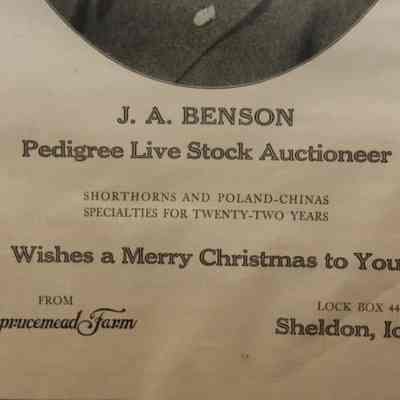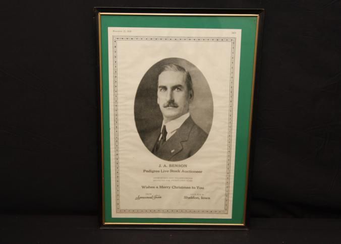 FR AD, 1919, IA. J.A. BENSON, PEDIGREE LIVE STOCK AUCTIONEER WISHES A MERRY CHRISTMAS TO YOU. B/W PORTRAIT. 12" X 16 1/4"Created By
