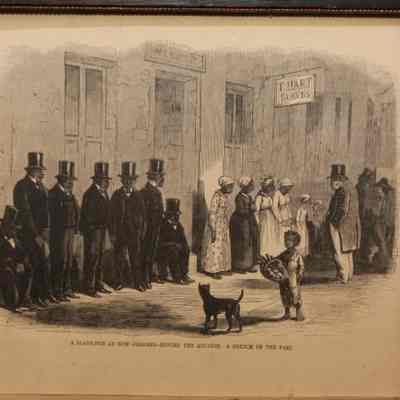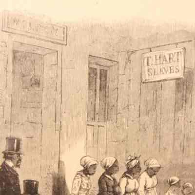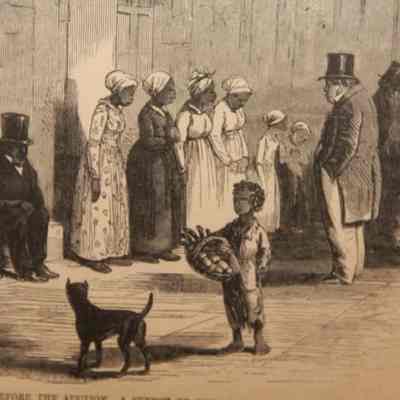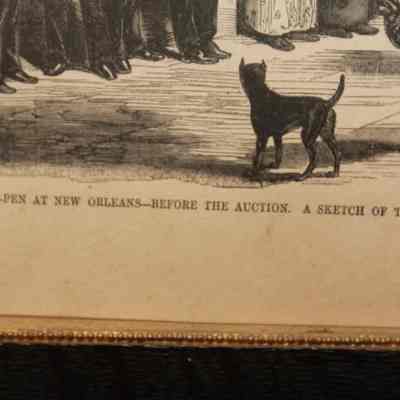 FR PRINT, SLAVE, NO DATE, NEW ORLEANS, LA. "A SLAVE PEN AT NEW ORLEANS - BEFORE THE AUCTION. A SKETCH OF THE PAST" DEPICTION OF LINE UP OF SLAVES, WITH MEN LOOKING THEM OVER. 11 3/4" X 9 1/2"Created By