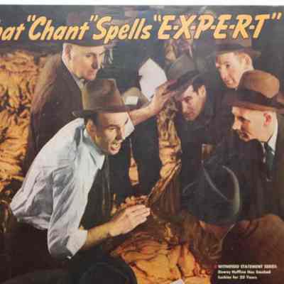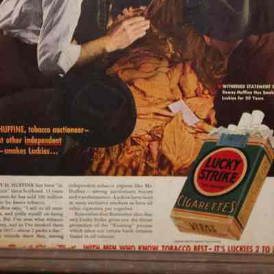 FR AD, NO DATE. COLOR PHOTO AUCTIONEER AND CROWD, TOBACCO. "DEWEY HUFFINE, TOBACCO AUCTIONEER - LIKE MOST OTHER INDEPENDENT EXPERTS - SMOKES LUCKIES" 14 3/4" X 17"Created By
