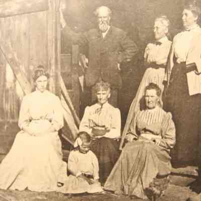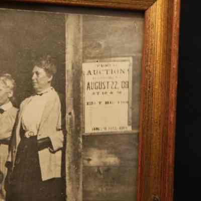 FR PHOTO, FAMILY OUTSIDE BARN WITH SIGN: AUCTION, AUG 22, '08. LOOKS LIKE 1808. 7 1/2" X 6"