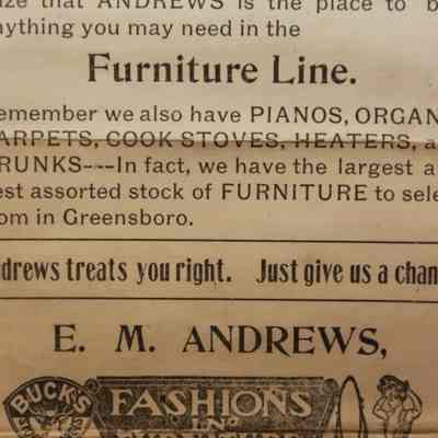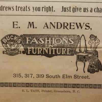 FR AD, E.M. ANDREWS THE GREAT DEPARTMENT FURNITURE STORE. THREE LARGE STORES IN ONE. ANDREWS TREATS YOU RIGHT. JUST GIVE US A CHANCE, FASHIONS AND FURNITURE. GREENSBORO, NC. 8 1/2" X 11"Created By