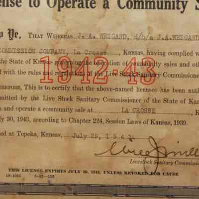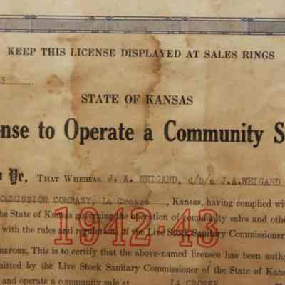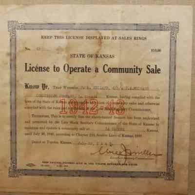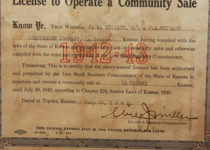 FR DOC, LICENSE, 1942, KS. STATE OF KANSAS LICENSE TO OPERATE A COMMUNITY SALE. J.A. WEIGAND COMMISSION COMPANY. 11 1/4" X 9 1/4"Created By