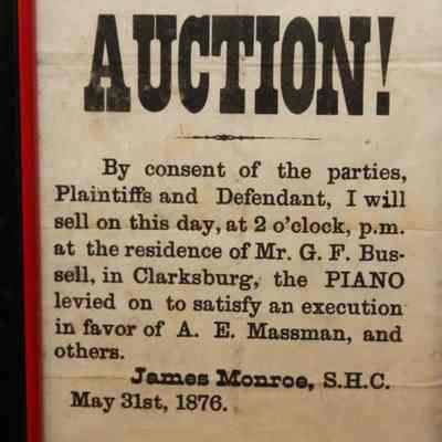 FR BROADSIDE, 1876, AUCTION! PIANO LEVIED ON TO SATISFY AN EXECUTION IN FAVOR OF A.E. MASSMAN AND OTHERS. JAMES MONROE, S.H.C 6" X 8"Created By