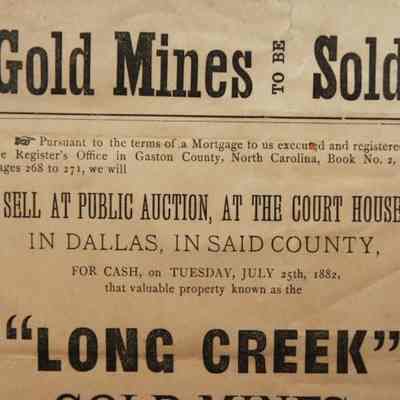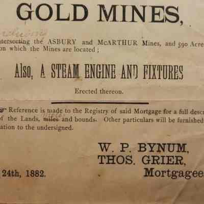 FR BROADSIDE, 1882, GOLD MINES, NC. LONG CREEK GOLD MINES, ASLO A STEAM ENGINE AND FIXTURES. W.P BYNUM, THOS. GRIER, MORTGAGEES. 9" X 11"Created By