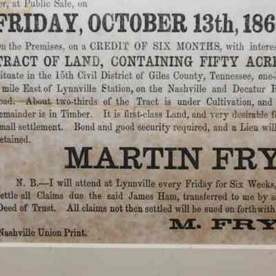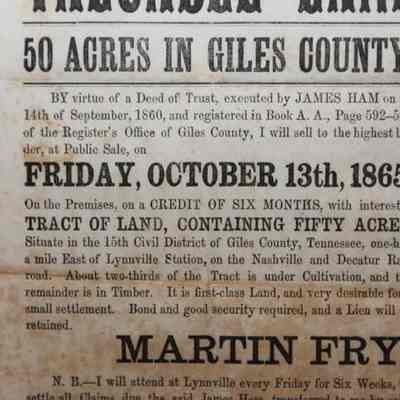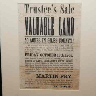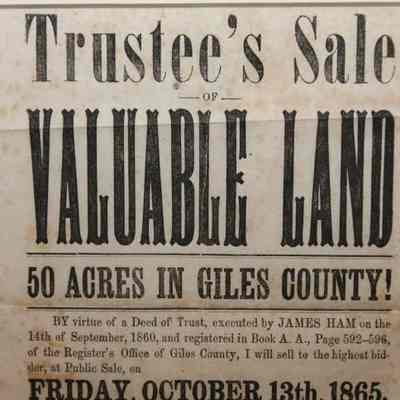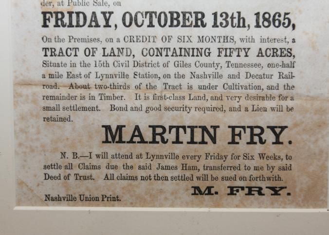 FR BROADSIDE, 1865, TN. TRUSTEE'S SALE OF VALUABLE LAND IN GILES COUNTY. MARTIN FRY. 11 1/2" X 13 1/2"Created By