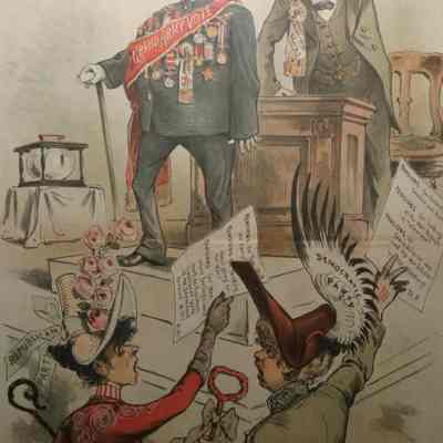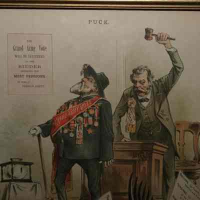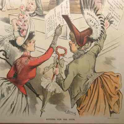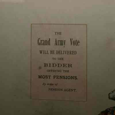 FR COLORED PRINT, POLITICAL. "BIDDING FOR HIS VOTE" TWO WOMEN IN FOREGROUND WAVING AGENDAS, PENSION AGENT WITH GAVEL. "THE GRAND ARMY VOTE WILL BE DELIVERED TO THE BIDDER OFFERING THE MOST PENSIONS BY ORDER OF PENSION AGENT - SIGN ON WALL. 17 3/4" X 21 1/2"Created By