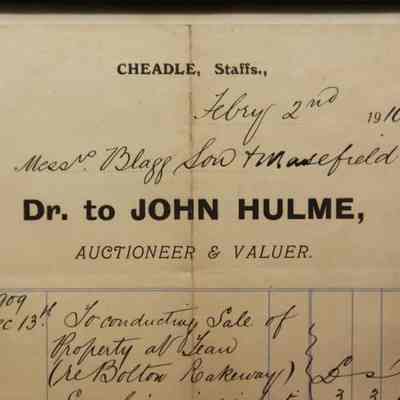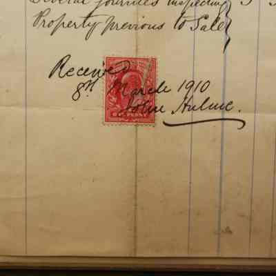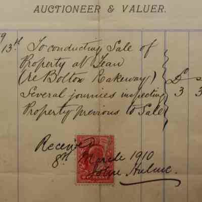 FR DOC, RECEIPT, 1910, JOHN HULME, AUCTIONEER AND VALUER. 6 1/2" X 8 1/2"