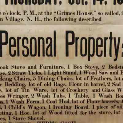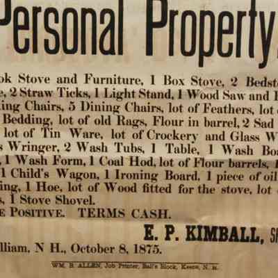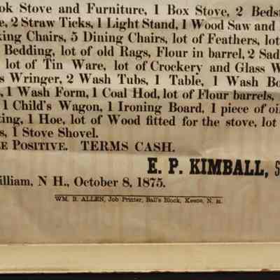 FR BROADSIDE, 1875, NH. SHERIFF'S SALE, FURNITURE, HOUSEHOLD. E.P. KIMBALL, SHERIFF. 15" X 24"