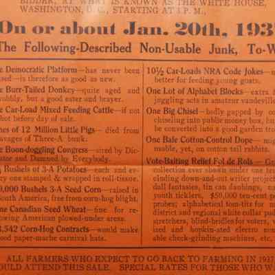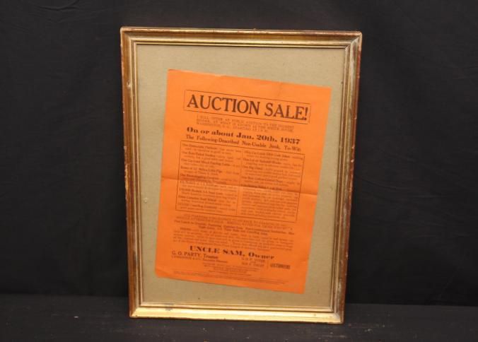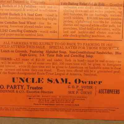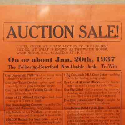 FR BROADSIDE, 1937, WASHINGTON DC. POLITICAL, 1 DEMOCRATIC PLATFORM, 1 BURR-TAILED DONKEY, ONE BOON-DOGGLING CONGRESS… ETC. UNCLE SAM, OWNER. G.O.P VOTER AND SUE P. COURT, AUCTIONEERS. 12" X 15"Created By