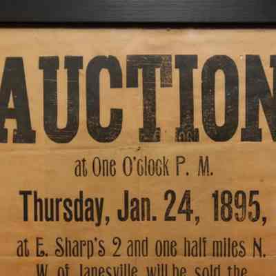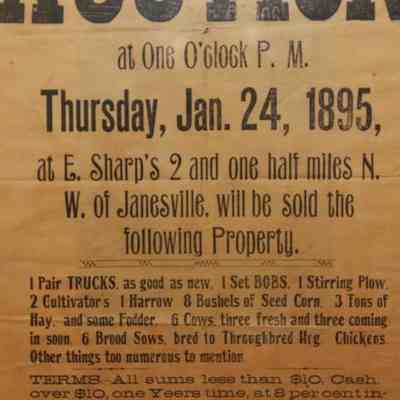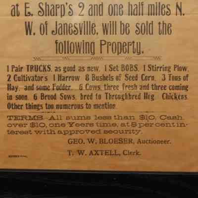 FR BROADSIDE, 1895, JANESVILLE. AUCTION! FARM EQUIPMENT. GEO. W. BLOESER, AUCTIONEER. 14" X 15"