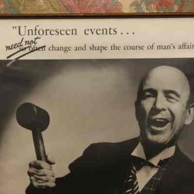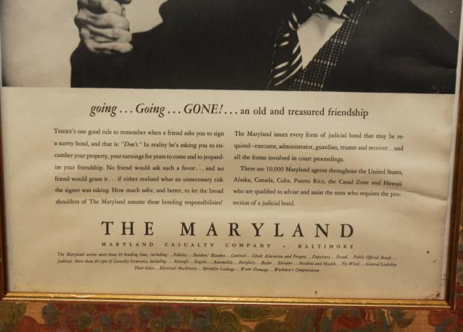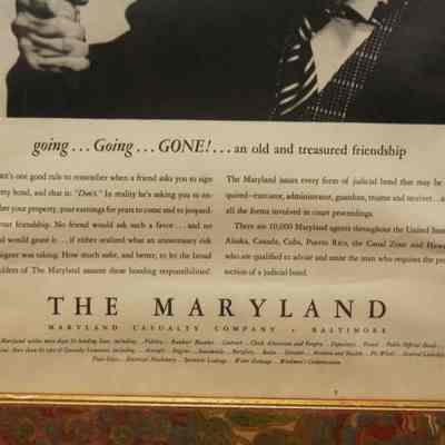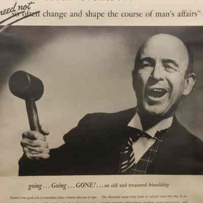 FR AD, "UNFORESEEN EVENTS… NEED NOT CHANGE AND SHAPE THE COURSE OF A MAN'S AFFAIRS" THE MARYLAND CASUALTY COMPANY, BALTIMORE, MD. B/W PHOTO OF AUCTIONEER AND GAVEL. 14" X 16"Created By