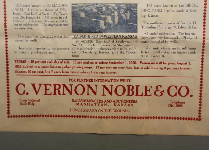FR BROADSIDE, 1926, LAND, KS. 560 A. EDWARDS COUNTY LAND. 3 FARMS AT AUCTION. C. VERNON NOBLE & CO., AUCTIONEERS. 17" X 28"Created By