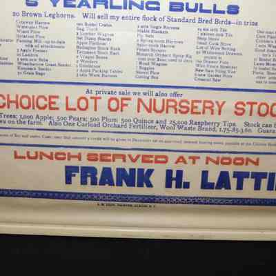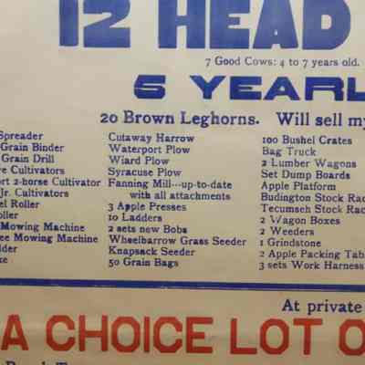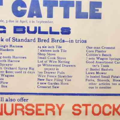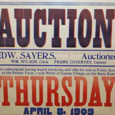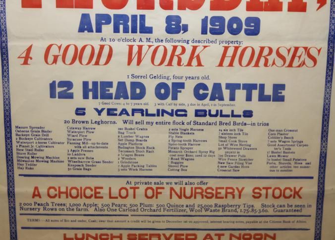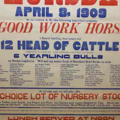 FR BROADSIDE, 1909, NY. LIVESTOCK. EDW. SAYERS, AUCTIONEER. 4 GOOD WORK HORSES, 12 HEAD OF CATTLE, 5 YEARLING BULLS, FRUIT TREES. 28" X 40"Created By