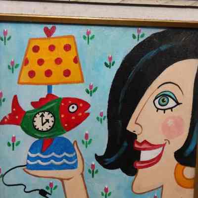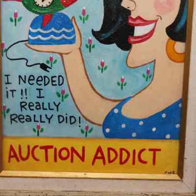 FR ARTWORK, PAINTING, "AUCTION ADDICT" SIGNED CMS. WOMAN WITH FISH CLOCK/LAMP AND QUOTE "I NEEDED IT, I REALLY REALLY DID!" 15" X 18"Created By