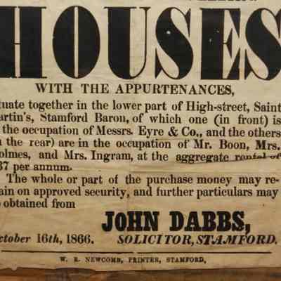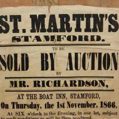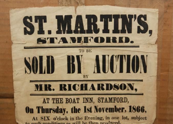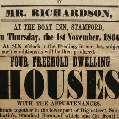 FR BROADSIDE, 1866, REAL ESTATE, STAMFORD. ST MARTINS TO BE SOLD BY AUCTION. MR RICHARDSON, AUCTIONEER. FOUR FREEHOLD DWELLING HOUSES. 13" X 16"Created By
