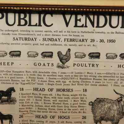 FR BROADSIDE, 1950, COMICAL. N.O. BODY, AUCTIONEER. THE UNDERSIGNED, INTENDING TO COMMIT SUICIDE, WILL SELL AT HIS FARM IN HULLERHECKA TOWNSHIP…. ETC. 9 1/2" X 11 1/2"Created By