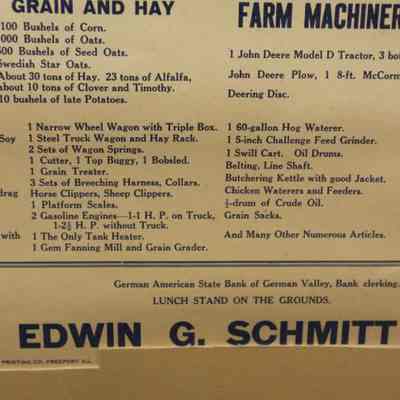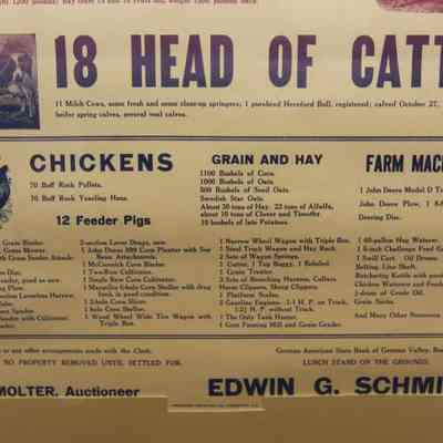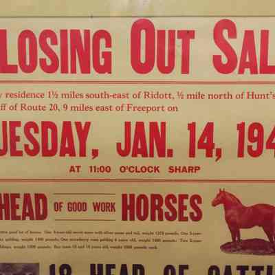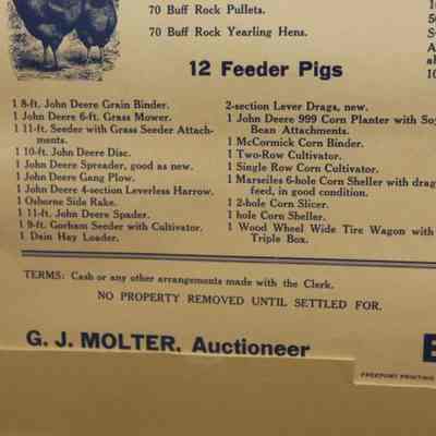 FR BROADSIDE, LIVESTOCK, 1941, IL. CLOSING OUT SALE. 7 HEAD OF HORSES, 18 HEAD OF CATTLE, CHICKENS, GRAIN, MACHINERY. G.J. MOLTER, AUCTIONEER. 22 1/4" X 26 1/4"Created By