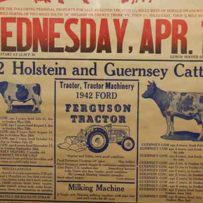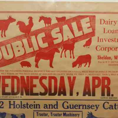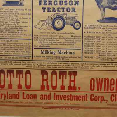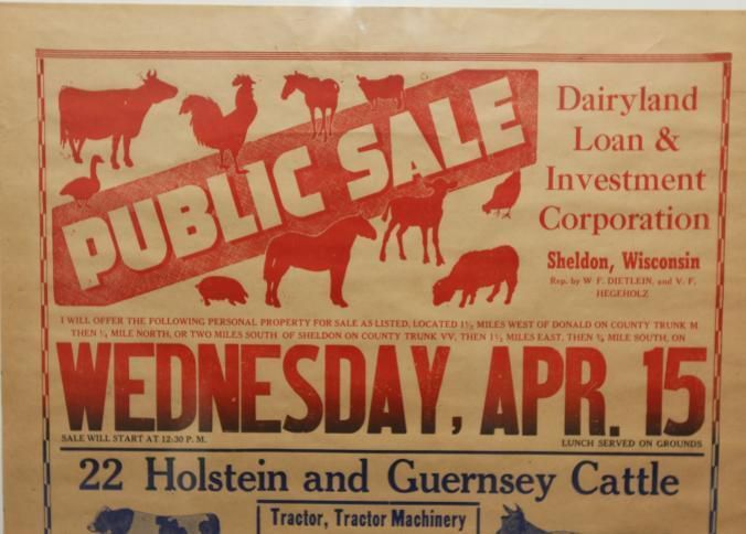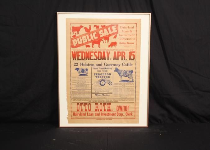 FR BROADSIDE, CATTLE, WI. DAIRYLAND LOAN & INVESTMENT CORPORATION. PUBLIC SALE, 22 HOLSTEIN & GUERNSEY CATTLE, 1942 FORD TRACTOR. COL. CLARENCE HUNT, COL. AUGUST JOHNSON, AUCTIONEERS. 22 1/4" X 26 1/4"Created By