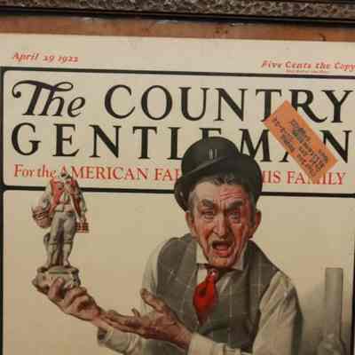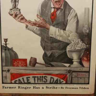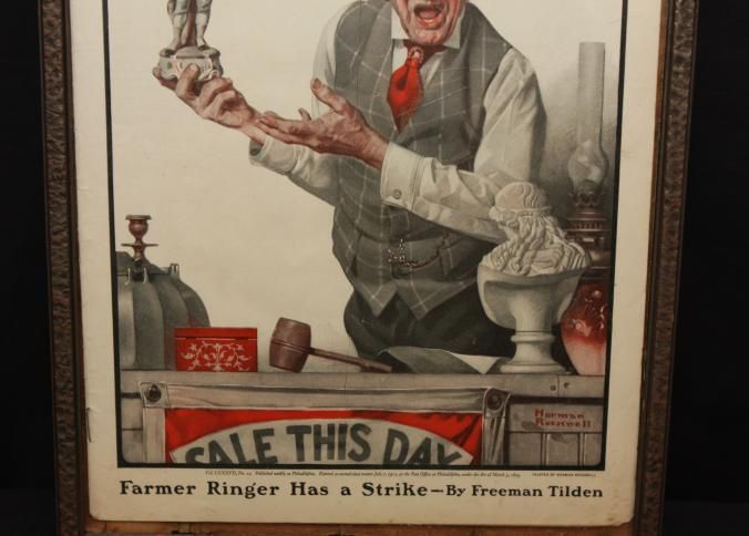 FR MAGAZINE, APRIL 1922, NORMAN ROCKWELL PRINT OF AUCTIONEER. "THE COUNTRY GENTLEMAN" FARMER RINGER HAS A STRIKE - BY FREEMAN TILDEN. 11 3/4" X 16"Created By
