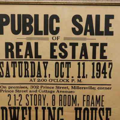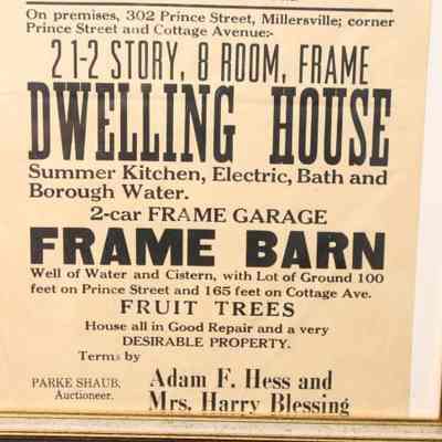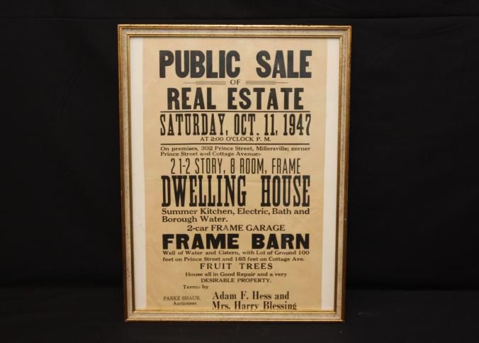 FR BROADSIDE, 1947, REAL ESTATE. PUBLIC SALE. 2 1/2 STORY, 8 ROOM, FRAME DWELLING HOUSE. 2 CAR FRAME GARAGE, FRAME BARN. PARKE SHAUB, AUCTIONEER. 15" X 18 1/2"Created By