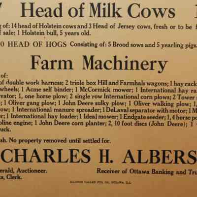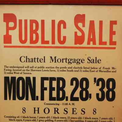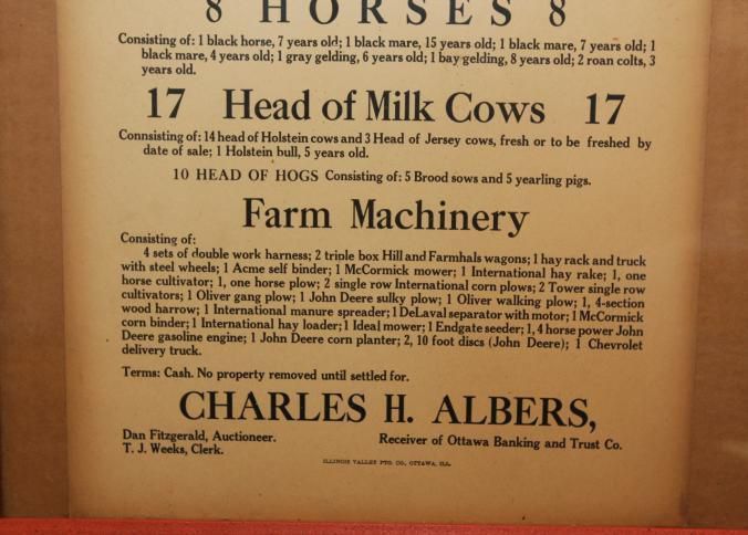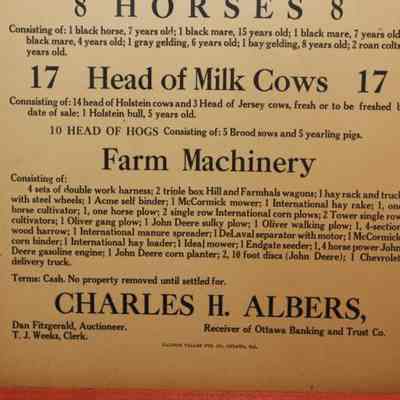 FR BROADSIDE, 1938, LIVESTOCK, IL. PUBLIC SALE, CHATTEL MORTGAGE SALE. 8 HORSES, 17 HEAD OF MILK COWS, FARM MACHINERY. DAN FITZGERALD, AUCTIONEER. 16 1/2" X 20"Created By