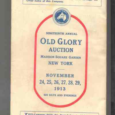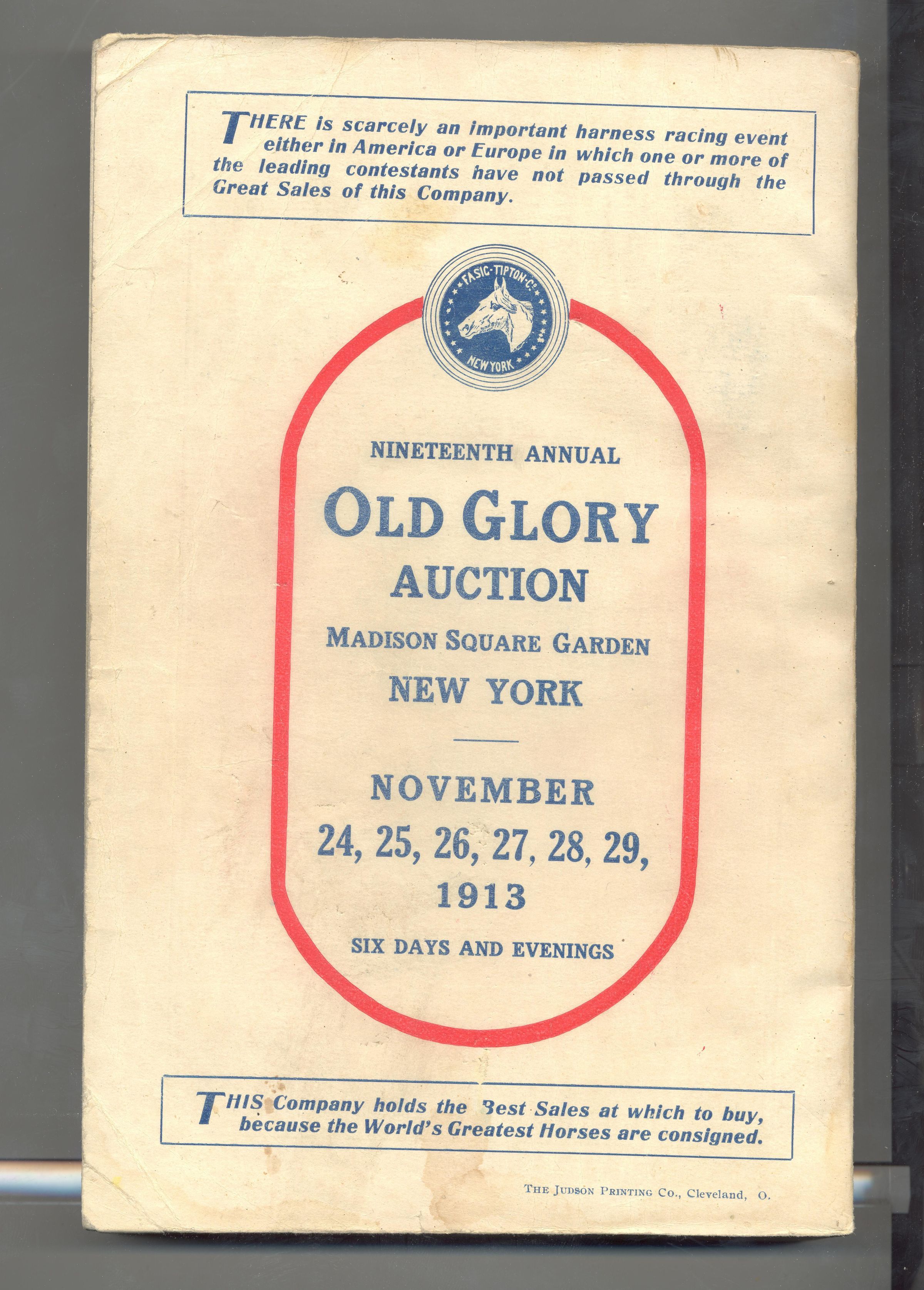 CAT, HORSE, 1913, NY. OLD GLORY HORSE AUCTION, "THE LEADING HARNESS HORSE AUCTION OF THE WORLD" FASIG-TIPTON CO, ED TIPTON, GEORGE BAIN, AUCTIONEERS. 6" X 9" X 1" PAGES NOT NUMBERED.Created By