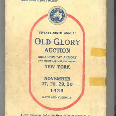 CAT, HORSE, 1923, NY. OLD GLORY HORSE AUCTION, "THE LEADING HARNESS HORSE AUCTION OF THE WORLD" FASIG-TIPTON CO, E.J. TRANTER AUCT. SOME PRICES & NAMES WRITTEN. 6" X 9" X 1/2" PAGES NOT NUMBERED.Created By