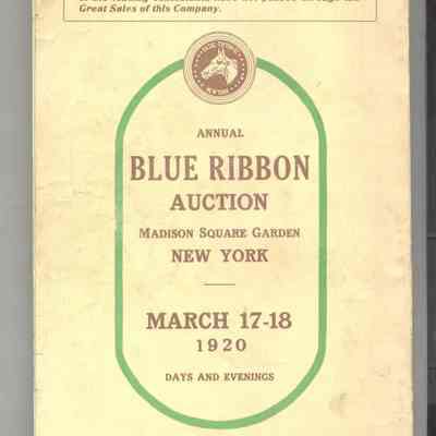 CAT, HORSE, 1920, NY. FASIG-TIPTON CO. BLUE RIBBON SALE. GEORGE BAIN, AUCTIONEER. "FAST, HIGH-BRED HARNESS HORSES FOR TRACK, ROAD, SPEEDWAY AND THE STUD" PAGES NOT NUMBERED. 6" X 9" X 3/8"Created By