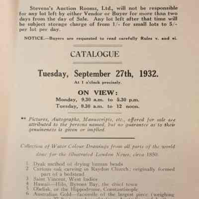 CAT, FURNITURE, 1932, ENGLAND. SALE NO. 14,870, STEVENS'S AUCTION ROOMS, LTD. SOME PRICES, 13 PP. 6 1/2" X 8 1/4"Created By