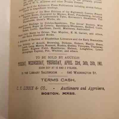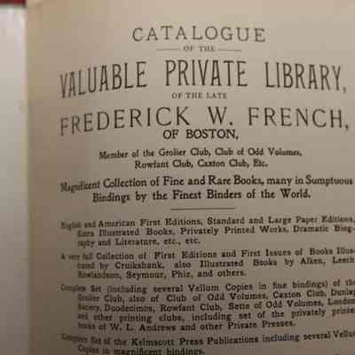 CAT, BOOKS, 1901, MA. PRIVATE LIBRARY OF FREDERICK W. FRENCH OF BOSTON, MA. C.F. LIBBIE & CO, AUCTS. B/W ILLUS, BINDING ROUGH. SOME PRICES, 237 PP. 6 1/4" X 9 3/4"Created By
