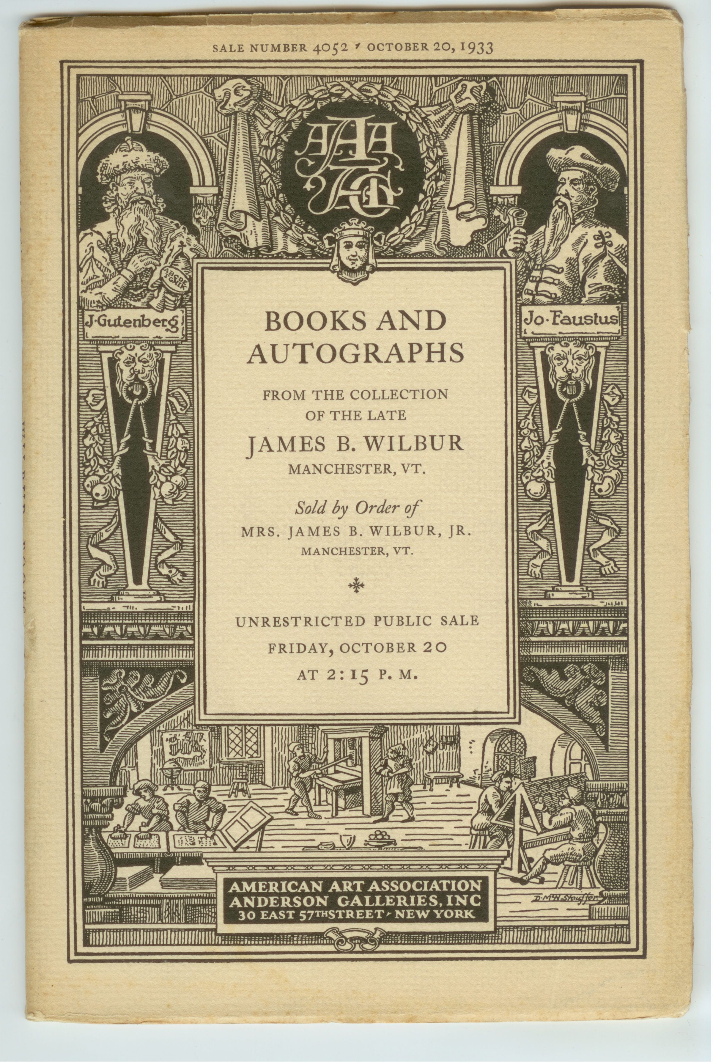 CAT, BOOKS, 1933, NY. SALE 4052, BOOKS AND AUTOGRAPHS, COLLECTION OF JAMES B. WILBUR. AMERICAN ART ASSOC, ANDERSON GALLERIES. 44 PP. 6 1/4" X 9 1/2"Created By