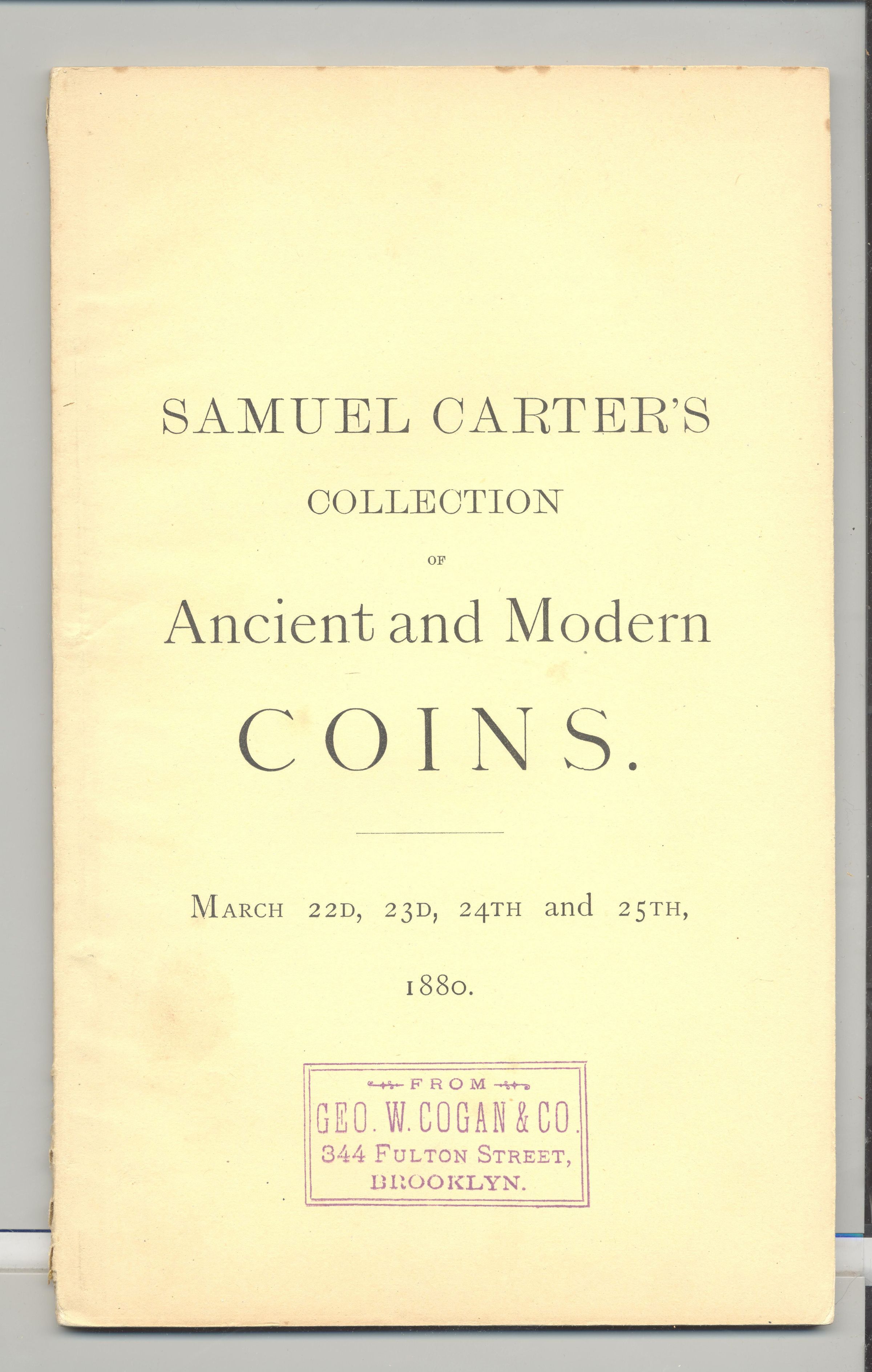 CAT, COINS, 1880, NY. SAMUEL CARTER'S COLLECTION OF ANCIENT AND MODERN COINS. BANGS & CO, AUCTS. 72 PP. 5 3/4" X 9 1/4"Created By