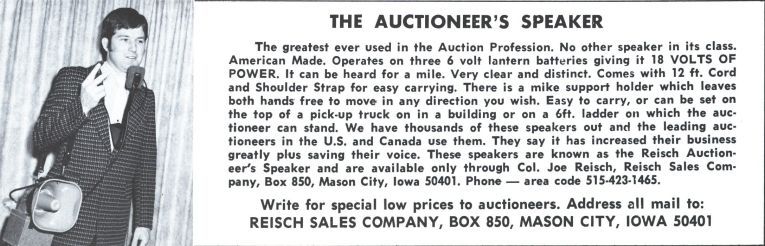 From an issue of The Auctioneer: The JR-1 is the most powerful portable speaker made. It is powered by three 6 voltage lantern batteries, giving it 18 volts of power. Batteries last 60 hours or more. Set weighs 8 pounds. Comes with a 12 inch cord and shoulder strap and microphone support holder, which leaves both hands free. Easy to carry at your side, or it can be placed on truck top, or used on a ladder.Context