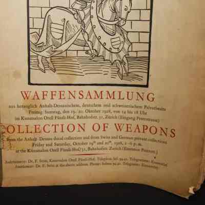 CAT, WEAPONS, 1928, ZURICH. FROM THE ANHALT-DESSAU DUCAL COLLECTION AND FROM SWISS AND GERMAN PRIVATE COLLECTIONS. DR. STORI, AUCTIONEER. 29 PP, ILLUS, PRINTED IN TWO LANGUAGES. 9 1/2" X 12"Created By