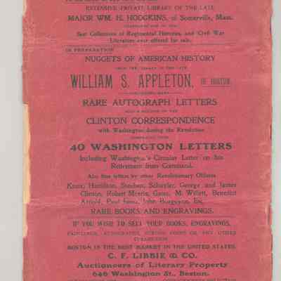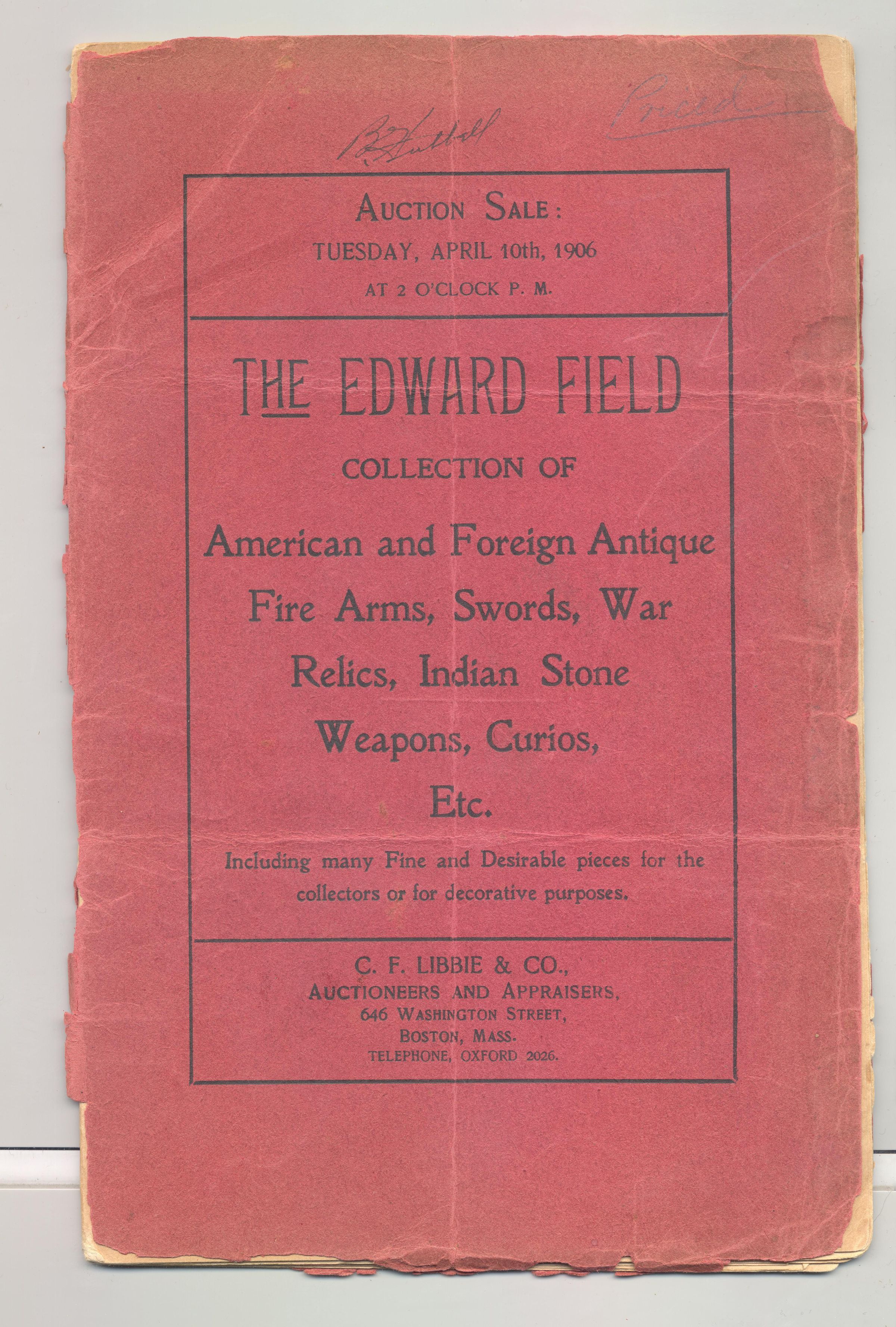 CAT, WEAPONS, 1906, MA. THE EDWARD FIELD COLLECTION OF AMERICAN AND FOREIGN ANTIQUE FIRE ARMS, SWORDS, WAR RELICS, INDIAN STONE WEAPONS, CURIOS, ETC. C.F. LIBBIE & CO, AUCTS. PRICED, 26 PP. 6" X 9 1/2"Created By