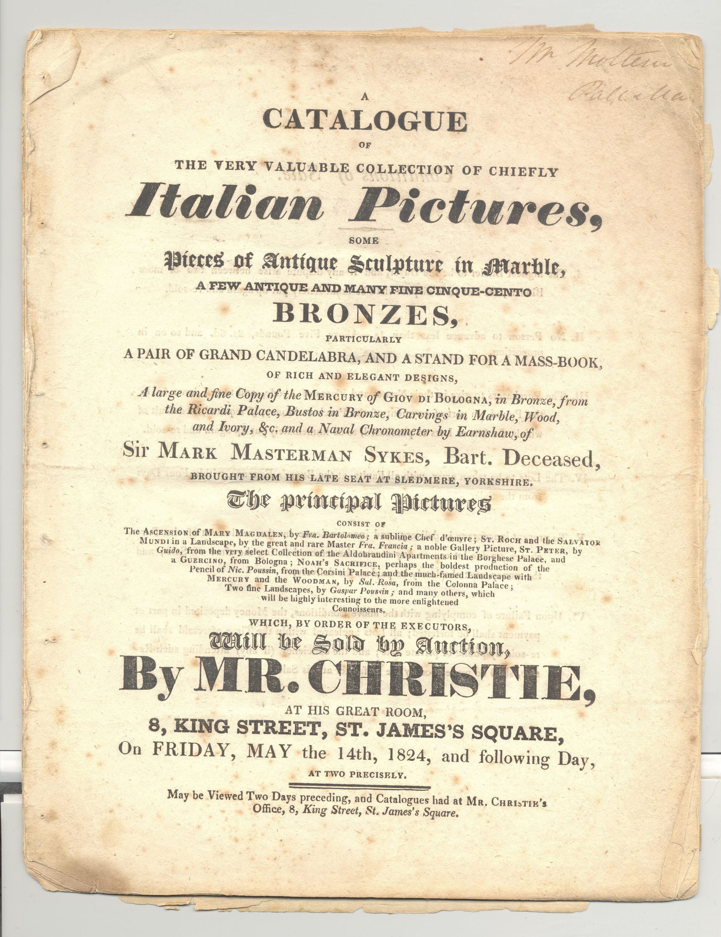 CAT, ART, 1824, LONDON. CHRISTIE'S AUCTS. ITALIAN PICTURES, SCULPTURE, BRONZES, ETC. PRICED, 15 PP. 8" X 10"Created By