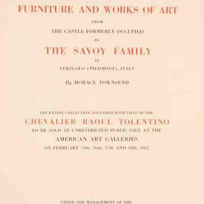 CAT, FURNITURE, 1922, NY. WORKS OF ART FROM THE CASTLE FORMERLY OCCUPIED BY THE SAVOY FAMILY, ITALY. AMERICAN ART ASSOC. PHOTOS, 28 PP. 8" X 11"Created By