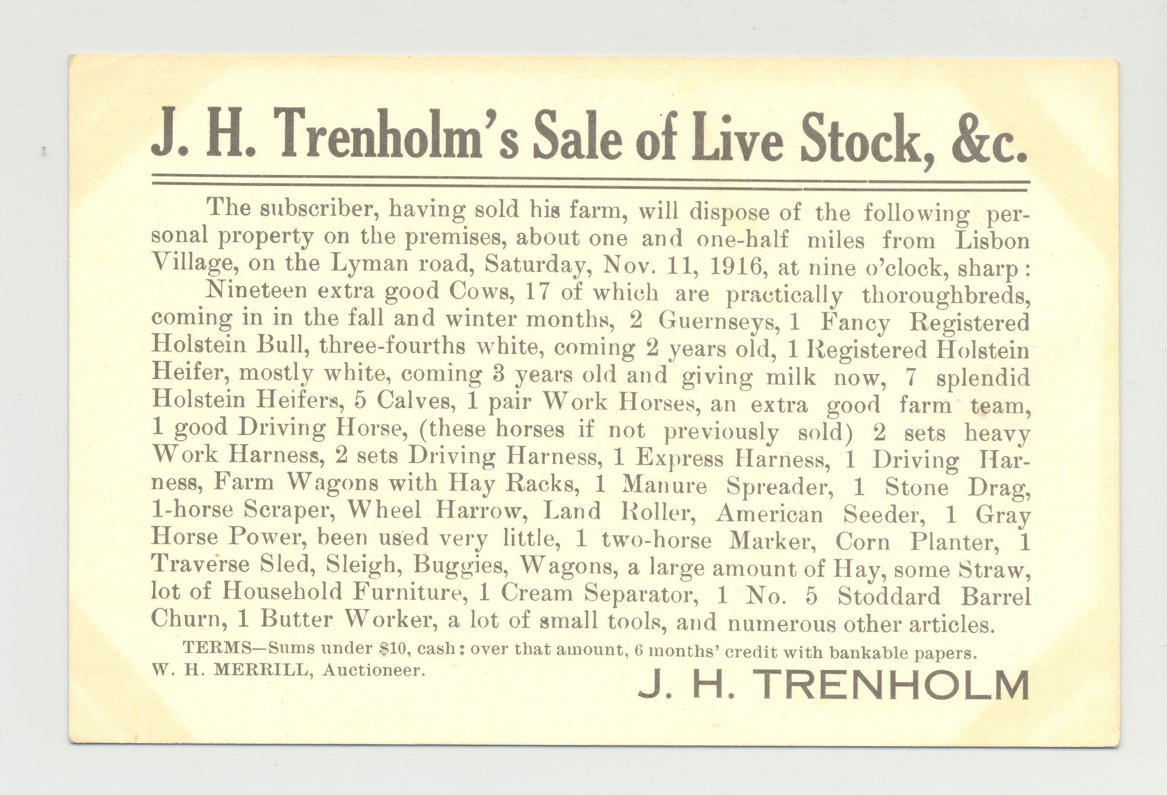 PSTCD, PERSONAL PROPERTY, 1916, BLANK BACK. "J.H. TRENHOLM'S SALE OF LIVE STOCK, ETC." W.H. MERRILL, AUCTIONEER.Created By