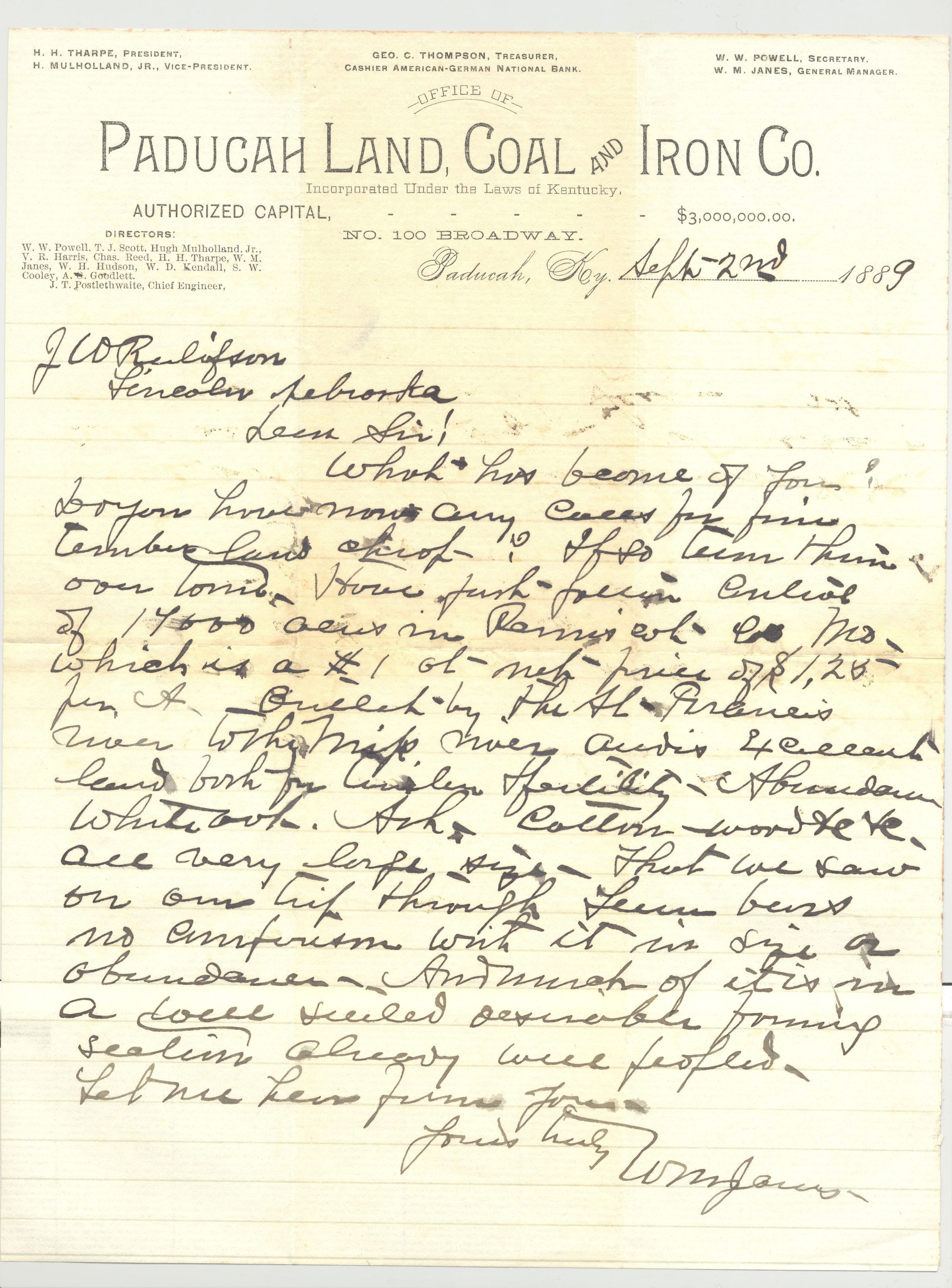 DOC, LETTER, 1889, KY. PADUCAH LAND, COAL AND IRON CO.