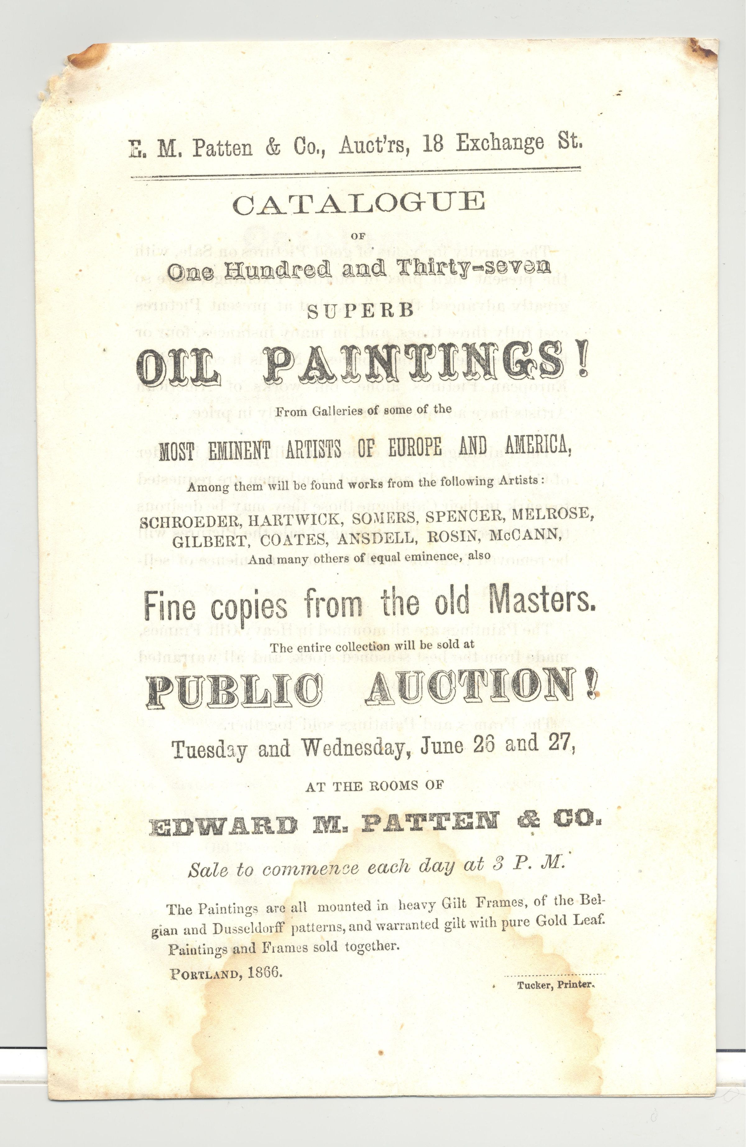 CAT, ART, 1866, PORTLAND. OIL PAINTINGS, EDWARD PATTEN & CO, AUCTIONEERS. 8 PP. 5 3/4" X 9"