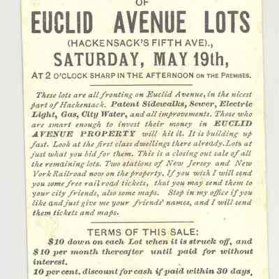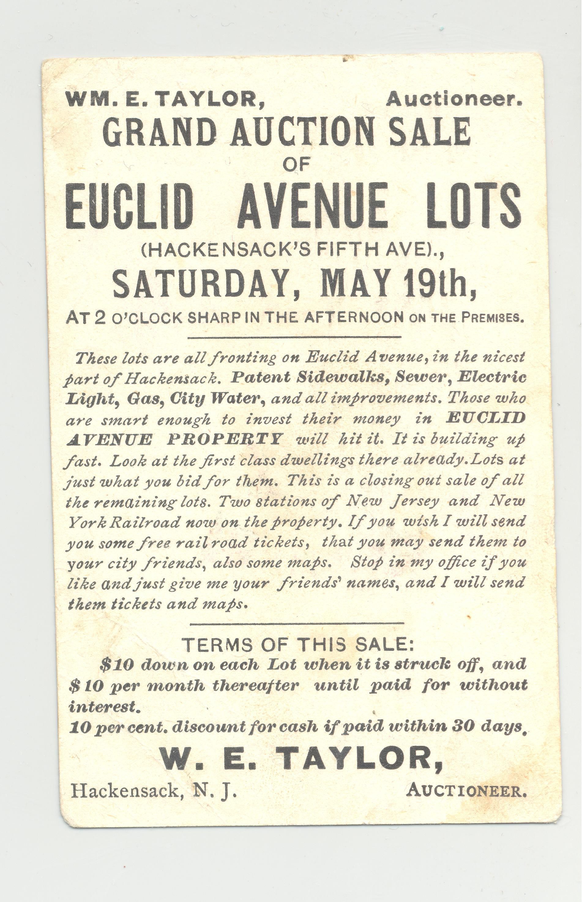 TRCD, AD FOR REAL ESTATE, NJ. MW TAYLOR AUCTIONEER. EUCLID AVE LOTS. COLOR PRINT OF GIRL AND TAMBOURINE ON FRONT, 2 3/4" X 4 1/4Created By